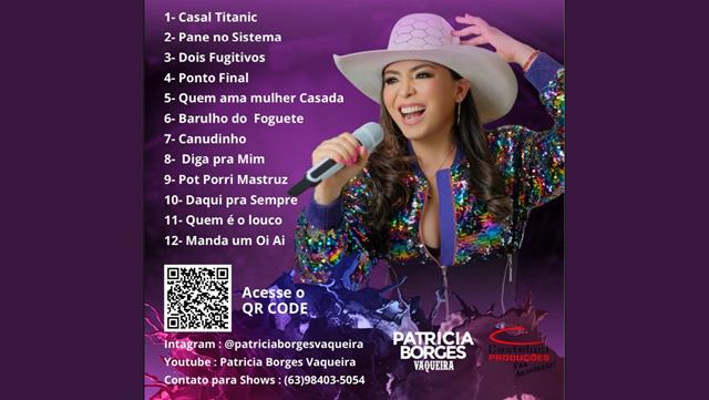 Patrícia Borges Vaqueira, reconhecida por sua paixão pelo Forró. surpreende seus fãs com um repertório diversificado que explora novas sonoridades sem perder a autenticidade que a caracteriza. As novas músicas refletem a riqueza habilidade da artista em se reinventar, mantendo-se fiel às suas raízes principalmente do Forró.