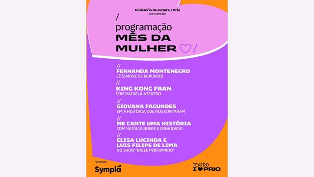 Como forma de celebrar e enaltecer a presença das mulheres no teatro, o I LOVE PRIO anuncia uma programação especial para março, o Mês da Mulher. Os amantes do teatro poderão conferir uma programação diversa, que vai de uma leitura dramática da emblemática Fernanda Montenegro sob a obra de Simone De Beauvoir; um talk show da jornalista, cantora e compositora Natália Boere; o espetáculo-show-performance King Kong Fran; o show “Baile Perfumado” de Elisa Lucinda; e ainda uma história musical reflexiva e engraçada de Giovana Fagundes. Juntas, essas artistas potentes aquecem a cena cultural carioca e fortalecem o teatro. Com curadoria de Caio Bucker, ao todo serão mais de 15 apresentações, entre os dias 1 e 31 de março, e os ingressos já estão disponíveis. Confira aqui.